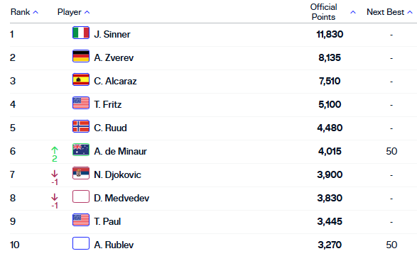 А ось фіналіст Роттердама Алекс де Мінаур покращив одразу дві позиції. Він знаходиться на 6-му місці, що є повторенням його особистого рекорду. Він обійшов Новака Джоковича та Данііла Медведєва.
