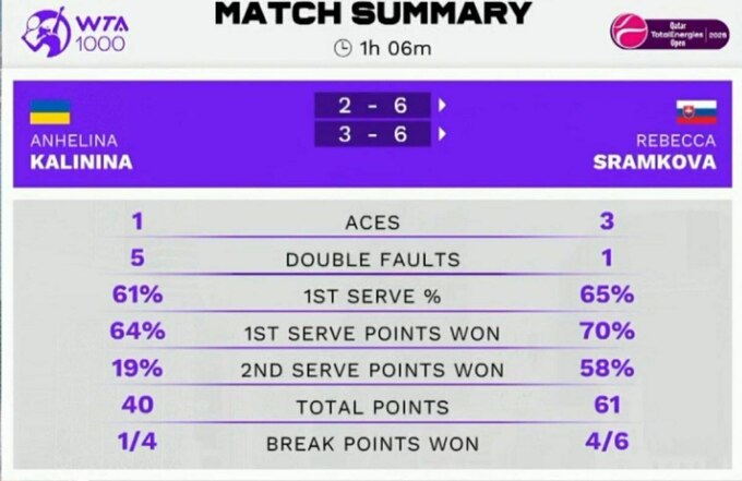 Ангеліна поступилася Ребеці Шрамковій у 1-му раунді змагань WTA 1000 у Катарі