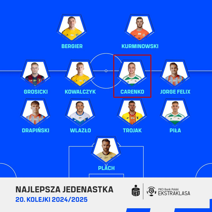 Півзахисник київського «Динамо» Антон Царенко, який виступає на правах оренди за «Лехію», потрапив до символічної збірної 20-го туру чемпіонату Польщі.