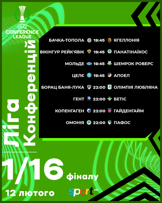 Увечері 13 лютого відбудуться перші поєдинки 1/16 фіналу Ліги конференцій