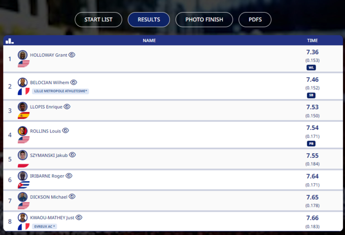 Грант Холлоуей впевнено переміг з результатом 7.36 і встановив найкращий результат сезону. Друге місце посів Вієм Белосян (Франція) – 7.46, бронзу здобув Енріке Льопіс (Іспанія) – 7.53. А поляк опинився на п'ятій сходинці з часом 7.55.
