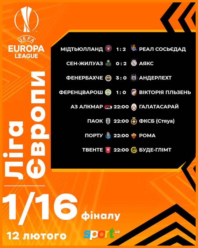⚽️ Ліга Європи. 1/16 фіналу. Перші матчі, 13 лютого