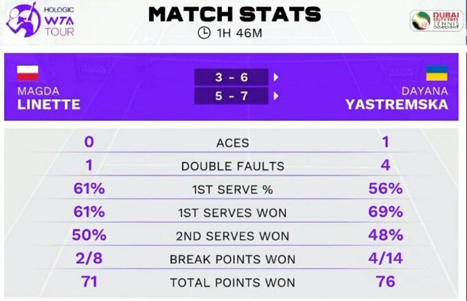 Українська тенісистка Даяна Ястремська (WTA 49) успішно стартувала на хардовому турнірі WTA 1000 у Дубаї, ОАЕ.