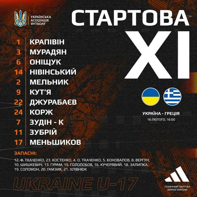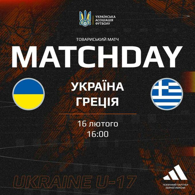 16 лютого о 16:00 юнацька збірна України U-17 у Хорватії проводить товариський поєдинок проти команди Греції U-17.
