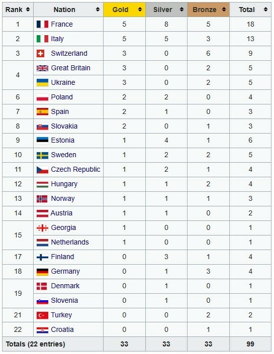 У топ-3 увійшли команди Франції – 18 нагород (5–8–5), Італії (5–5–3) та Швейцарії (3–0–6).