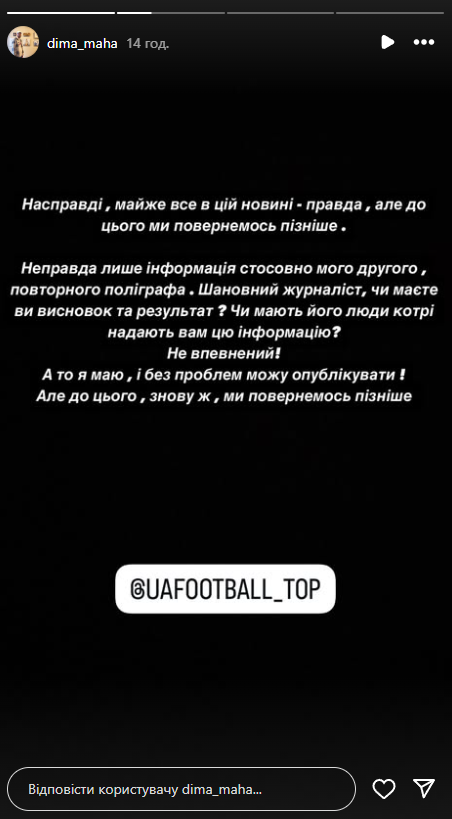 Те, що я проходив поліграф – це правда. Більше того – на повторному поліграфу наполягав саме я, як і на тому, щоб результати були не тільки в клубу, а й у мене – для того, щоб знати, що правда на моєму боці. Але хочу підкреслити те, що пошуками та організацією повторного поліграфу займався клуб, щоб зберегти неупередженість. Проходження другого поліграфу – це конфіденційна інформація, особливо про те, що я сам сплачував послуги цього поліграфа. Цю інформацію знали тільки я та клуб. А новина на вищезгаданому сайті написана таким тоном, буцімто мене прибрали з команди на фоні невдалого проходження другого поліграфу, але це неправда.