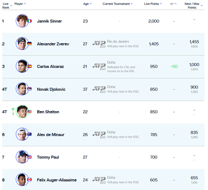 Зі змін у топ-10: Алекс де Мінаур опустив на восьму позицію, а Данило Медведєв став шостим. Яннік Сіннер, якого 15 лютого дискваліфікували на 3 місяці, залишається першою ракеткою. Александр Звєрєв – другий, Карлос Алькарас – третій.
