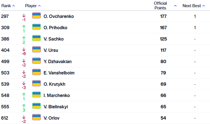 Що стосується українських тенісистів, то Олександр Овчаренко залишився першим номером країни, зберігши місце в топ-100 - він 297-й.