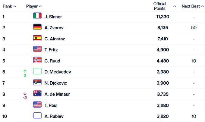 У гонці на Підсумковий турнір 2025 лідером залишається Яннік Сіннер. У топ-5 також Александр Звєрєв, Карлос Алькарас, Новак Джокович і Бен Шелтон.
