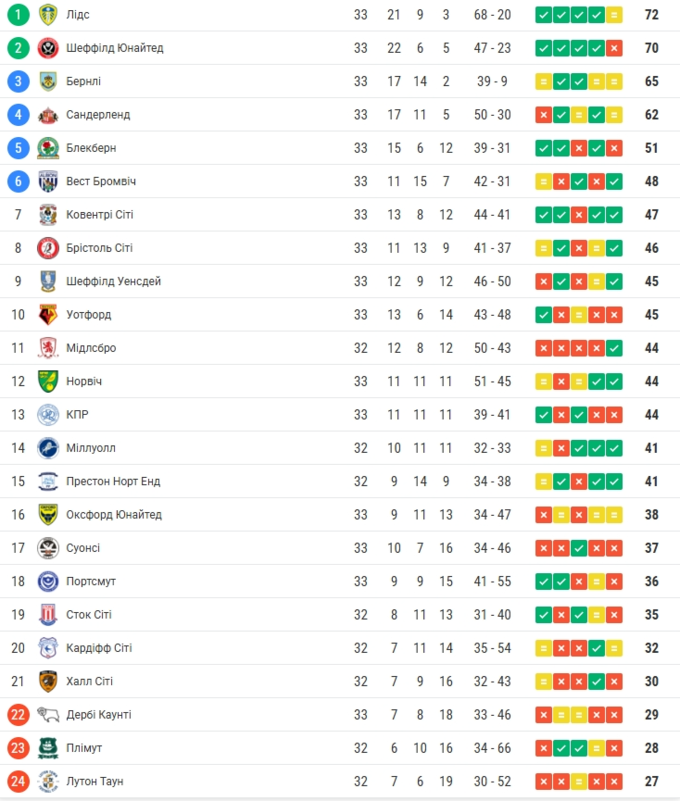 У зоні плей-оф утримуються Бернлі (65), Сандерленд (62), Блекберн (51) та Вест Бромвіч (48).