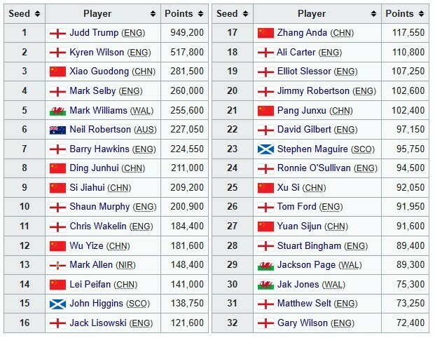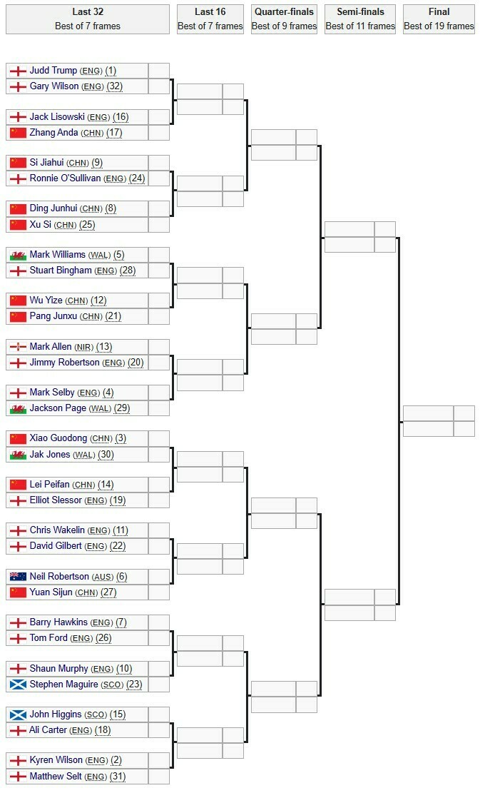 Лідер світового рейтингу Джадд Трамп відкриє турнір матчем проти Гері Вілсона (32-й номер рейтингу). Діючий чемпіон світу Кайрен Вілсон, який наразі посідає 2-гу позицію, зустрінеться з Меттью Селтом (31-й номер рейтингу).