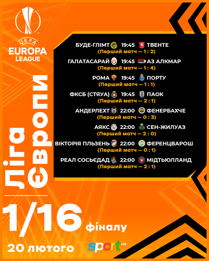 ⚽️ Ліга Європи. 1/16 фіналу. Матчі-відповіді, 20 лютого