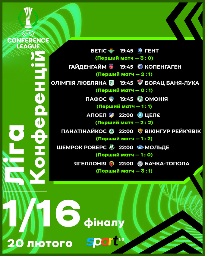 ⚽️ Ліга конференцій. 1/16 фіналу. Матчі у відповідь, 20 лютого