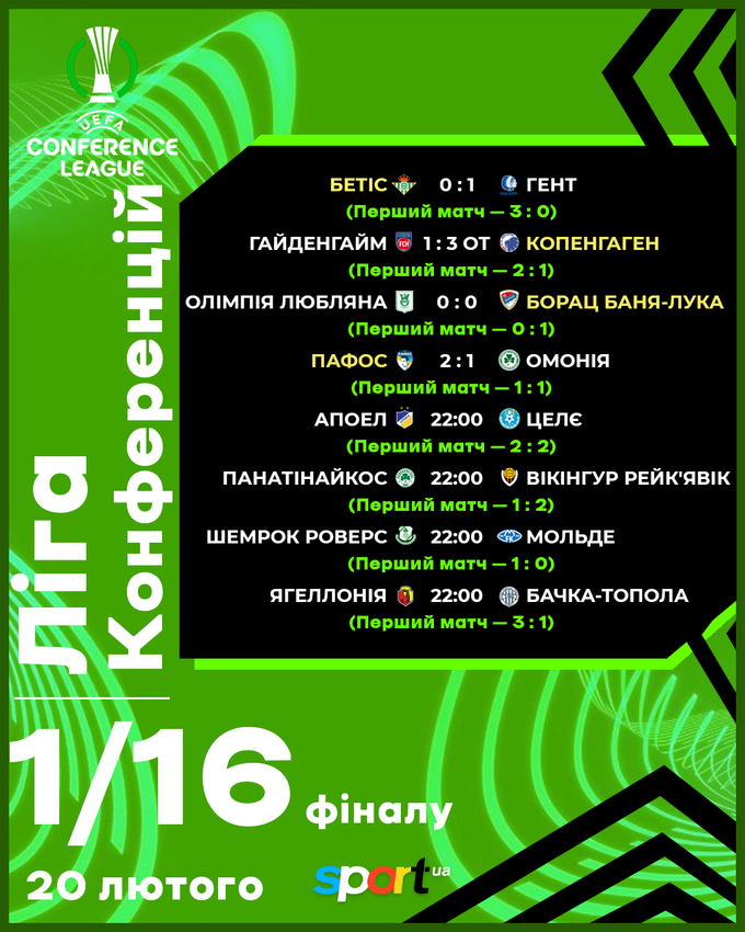 Увечері 20 лютого проходять поєдинки-відповіді 1/16 фіналу Ліги конференцій.
