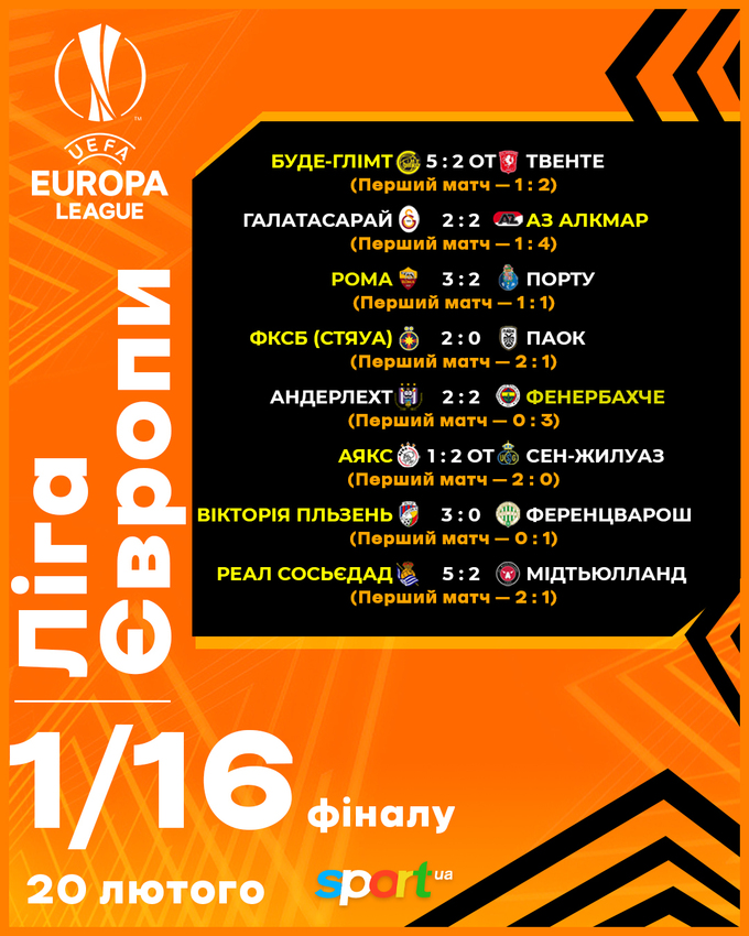 Увечері 20 лютого відбулися матчі-відповіді 1/16 фіналу Ліги Європи.