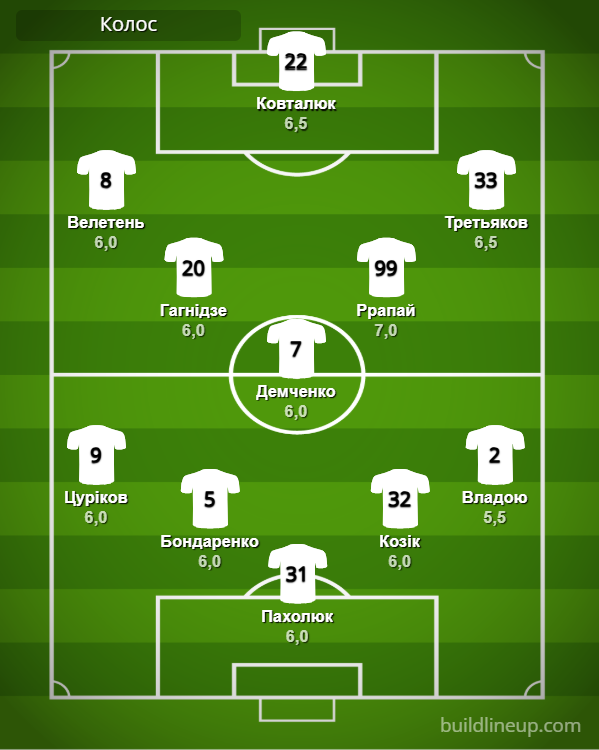 «Колос»: Пахолюк – Цуріков, Бондаренко, Козік, Владою (Поправка, 70) – Гагнідзе, Демченко, Ррапай (Оріховський, 85) – Велетень (Денисенко, 89), Ковталюк (Болівар, 70), Третьяков (Алефіренко, 70).