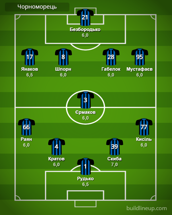 «Чорноморець»: Рудько – Раян, Кратов, Скиба, Кисіль – Єрмаков (Робакідзе, 71) – Янаков (Попов, 71), Шпорн, Габелок (Хобленко, 76), Мустафаєв (Кайо, 89) – Безбородько (Шевцов, 89).