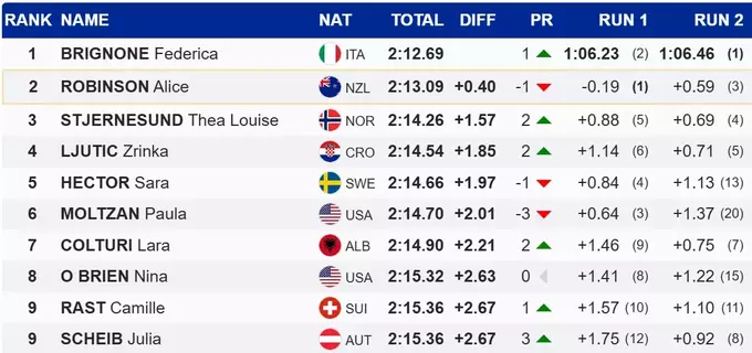 За нею розташувалася представниця Нової Зеландії Еліс Робінсон, якій для перемоги не вистачило 0.4 секунди. Трійку замкнула учасниця з Норвегії Теа Луїза Стьєрнесунд.