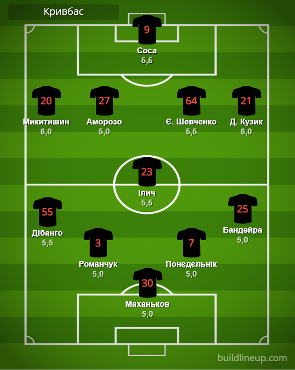 «Кривбас»: Маханьков – Дібанго, Романчук, Понєдєльнік, Бандейра (Задерака, 56) – Ілич – Микитишин (Кожушко, 73), Аморозо (Луньов, 46), Я. Шевченко (Мендоза, 46), Д. Кузик – Соса (Каменський, 83).