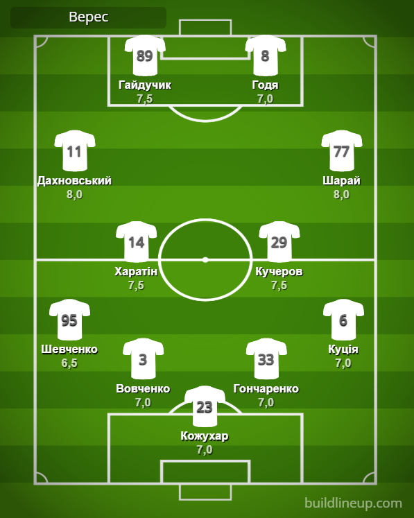 «Верес»: Кожухар – Є. Шевченко, Вовченко, Гончаренко, Куція – Харатін, Кучеров (Баран, 88) – Дахновський (Сміян, 88), Шарай (Кльоц, 80) – Гайдучик, Годя (Луан, 62).