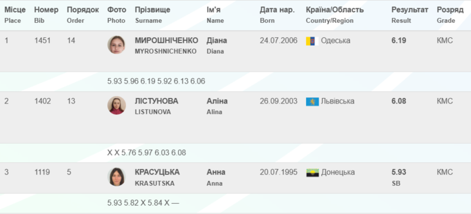 У жіночих змаганнях чемпіонкою стала Діана Мирошніченко, вона у найкращій спробі показала результат 6.19 м. Друге місце посіла Аліна Лістунова – 6.08, бронза в Анни Красуцької – 5.93 м.