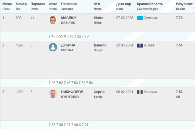 У чоловіків чемпіоном став Нікіта Маслюк, показавши результат 7.70 м. Срібло взяв Данило Дубина – 7.54, третє місце посів Сергій Никифоров – 7.53 с.