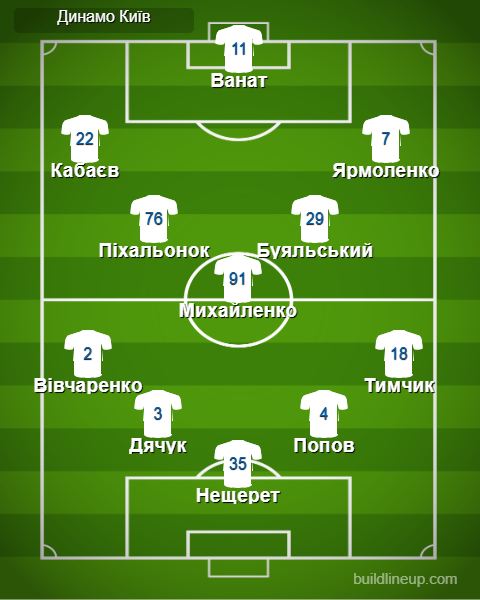 «Динамо»: Нещерет – Тимчик, Попов, Михавко, Вівчаренко (Дубінчак, 79) – Буяльський (Шапаренко, 79), Михайленко (Рубчинський, 85), Піхальонок (Бражко, 65) – Ярмоленко (Волошин, 65), Ванат, Кабаєв