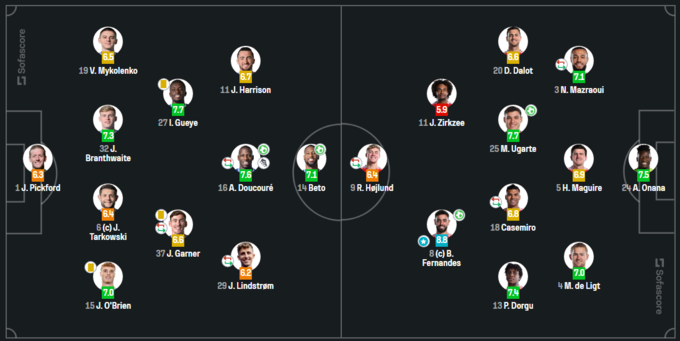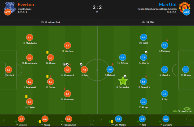 Український захисник «Евертона» Віталій Миколенко провів на полі весь матч, результативними діями не відзначився. Статистичний портал SofaScore оцінив гру українця в 6.5 бала, WhoScored же дав Віталію 6.4 бала. Найкращим гравцем матчу за версією обох порталів було визнано півзахисника гостей Бруну Фернандеша. На його рахунку 1 забитий м'яч і оцінки 8.8 і 9.0 відповідно.