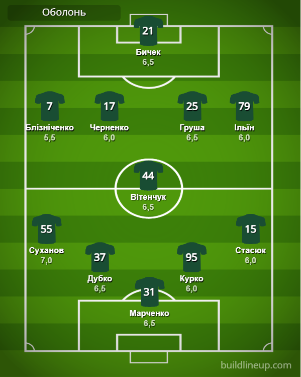 «Оболонь»: Марченко – Суханов, Дубко, Курко, Стасюк – Вітенчук (Мороз, 90+1) – Блізніченко (Тарануха, 46), Черненко (Ломницький, 90+2), Груша (Слободян, 82), Ільїн – Бичек (Устименко, 76).
