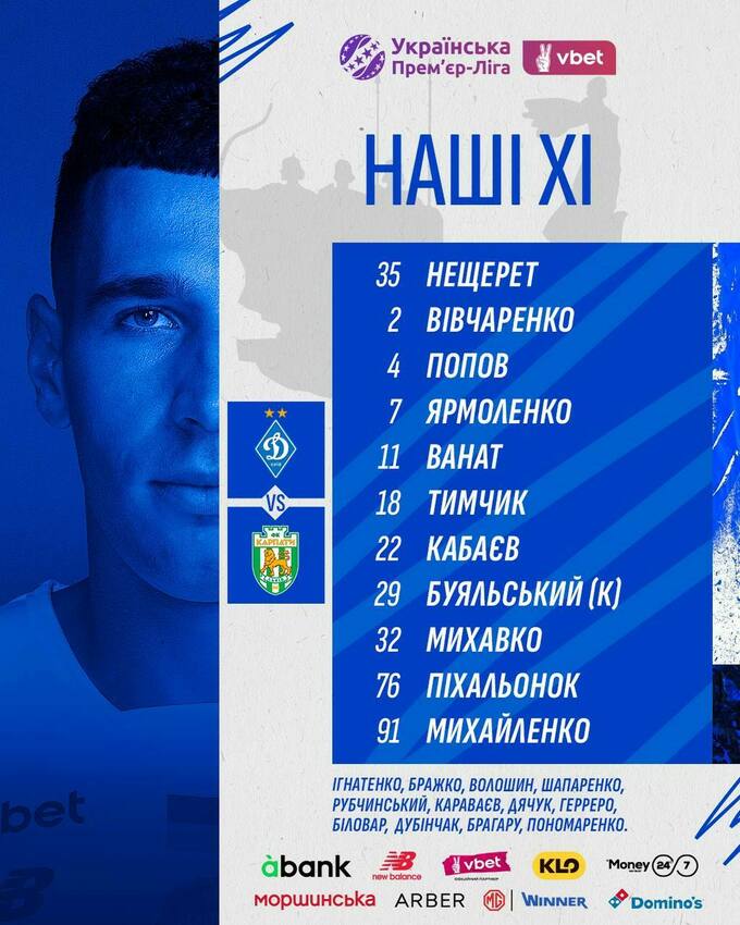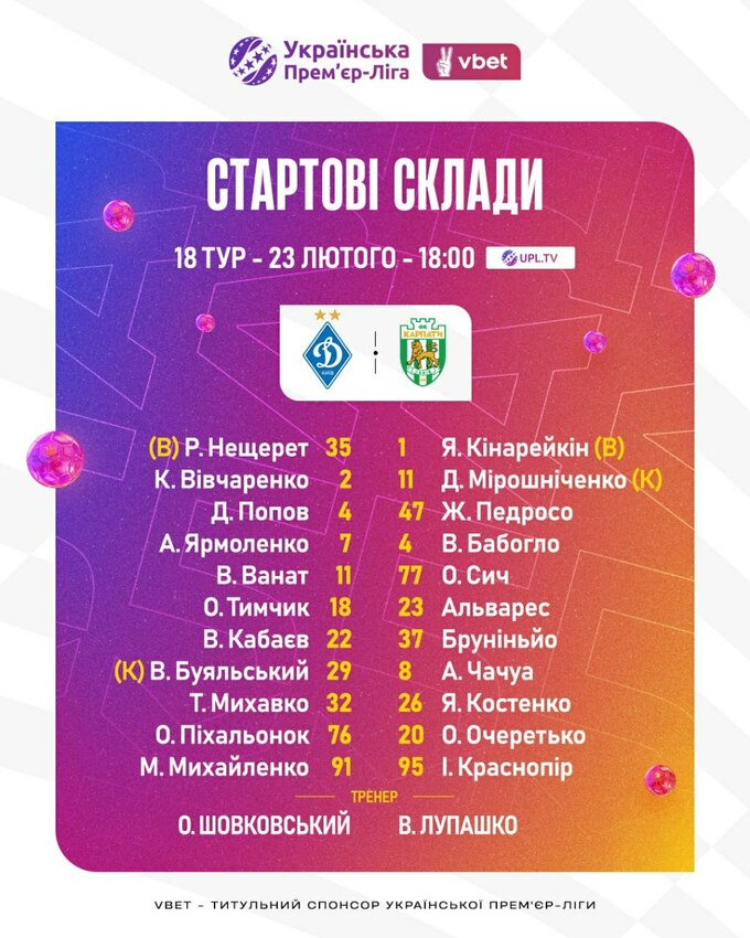 Оприлюднено стартові склади команд на матч між Динамо та Карпатами