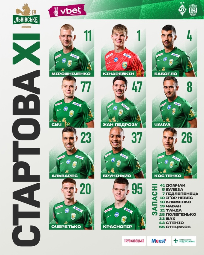 Карпати: Кінарейкін, Мірошніченко, Жан Педросо, Бабогло, Сич, Альварес, Бруніньо, Чачуа, Костенко, Очеретько, Краснопір.