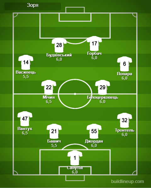 «Зоря»: Сапутін, Вантух, Башич, Джордан, Тронтель — Василець (Яцик, 62), Мічин, Білоцерковець, Попара — Горбач (Вакула, 62), Будківський (Супряга, 78)