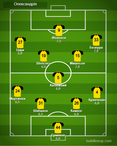«Олександрія»: Єрмаков — Мартинюк (Смирний, 79), Шабанов, Кампос, Кравченко — Калюжний — Цара (Бєляєв, 72), Мишньов (Ковалець, 72), Шепєлєв (Копина, 83), Безерра — Філіппов (Кулаков, 83)
