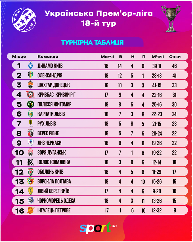 Топ-п'ятірка УПЛ: Динамо Київ (46), Олександрія (41), Шахтар (33), Кривбас (31), Полісся (30).