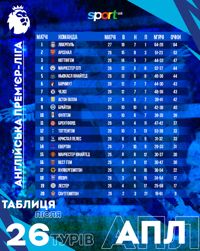 Топ-10 АПЛ: Ліверпуль (64 очки), Арсенал (53), Ноттінгем Форест (47), Ман Сіті, Ньюкасл (44), Борнмут, Челсі (43), Астон Вілла (42), Брайтон (40), Фулхем (39).