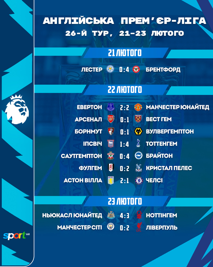 З 21 до 23 лютого відбулися матчі 26-го туру Англійської Прем'єр-ліги.