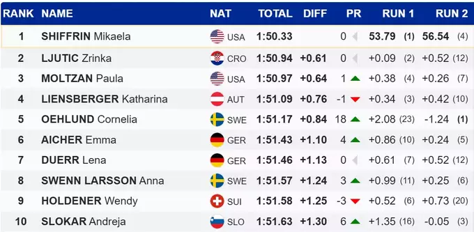 За нею розташувалася учасниця з Хорватії Зрінка Лютіч, яка стала лідеркою в слаломному заліку КС. А от на третій позиції опинилася інша представниця США Пола Мольцан, яка програла Мікаелі 0.64 секунди.