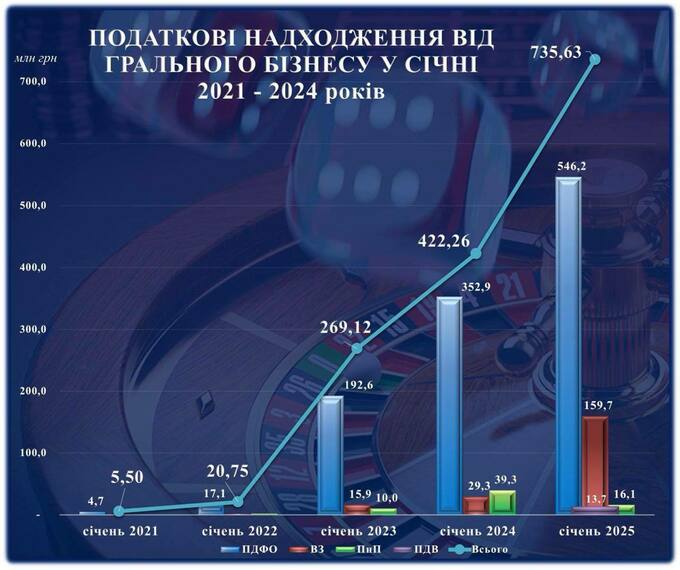 Податкові надходження від грального бізнесу в січні 2025 року досягли 735,63 млн грн, що свідчить про зростання на 74,2% у порівнянні з аналогічним періодом 2024 року. Порівняно із січнем 2021 року (5,5 млн грн) цей показник зріс у 134 рази.