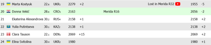 Таким чином, Марта Костюк наступний тиждень точно розпочне нижче за Еліну Світоліну (WTA 24), яка додала собі одну позицію в рейтингу і, так само як і Марта, на цьому тижні більше не гратиме.