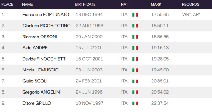 Бронзовий призер чемпіонату Європи Франческо Фортунато продемонстрував результат 17:55.65. Це на 11 секунд швидше, ніж рекорд Михайла Щеннікова.