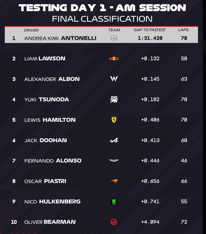 Найкращим у першій половині дня був новачок Мерседеса Андреа Кімі Антонеллі, який проїхав 78 кіл і випередив Лоусона. Гонщик Феррарі Льюїс Хемілтон проїхав 70 кіл з п'ятим найкращим результатом.