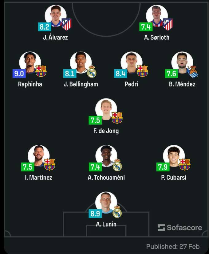 У ній знайшлося місце й українському голкіперу мадридського «Реала» Андрію Луніну. Його гру оцінили у 8.9 балів із 10 можливих, вищу оцінку отримав тільки бразильський вінгер «Барселони» Рафінья.