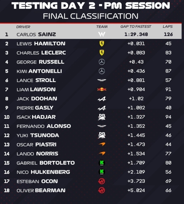 Вперше за півтора дня тестів трапилися технічні питання. Пілот Ред Булла Ліам Лоусон не закінчив ранкову сесію через проблеми з мотором, але повернувся на трасу ввечері. Макс Ферстаппен сьогодні відпочивав і завтра отримає повний тестовий день.