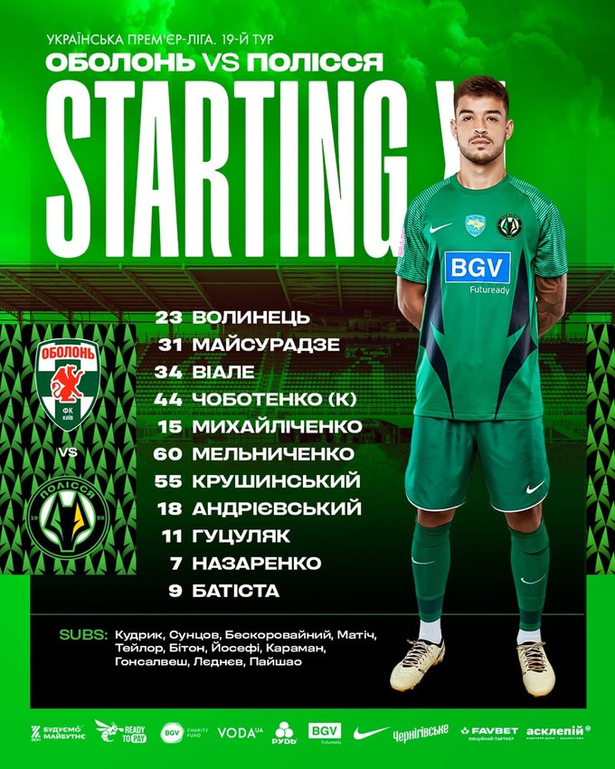«Полісся»: Волинець – Михайліченко, Чоботенко, Віале, Майсурадзе (Тейлор, 90+3) – Андрієвський, Мельниченко (Йосефі, 61), Крушинський (Гонсалвеш, 73) – Назаренко (Бітон, 46), Батіста, Гуцуляк.