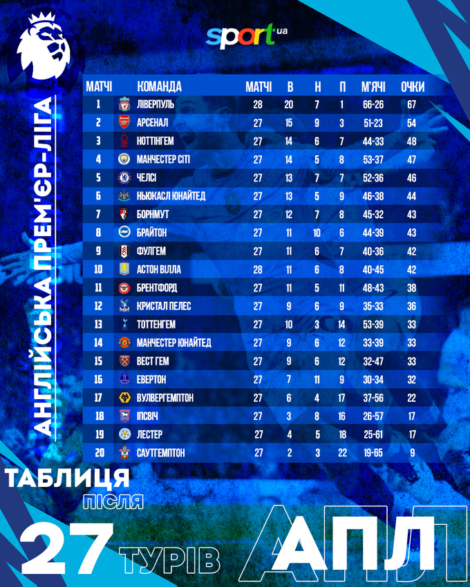 Топ-10 АПЛ: Ліверпуль (67 очок), Арсенал (54), Ноттінгем Форест (48), Манчестер Сіті (47), Челсі (46), Ньюкасл (44), Борнмут, Брайтон (43), Фулхем, Астон Вілла (42).