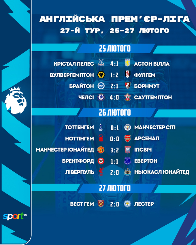 З 25 до 27 лютого відбулися матчі 27 туру Англійської Прем'єр-ліги.