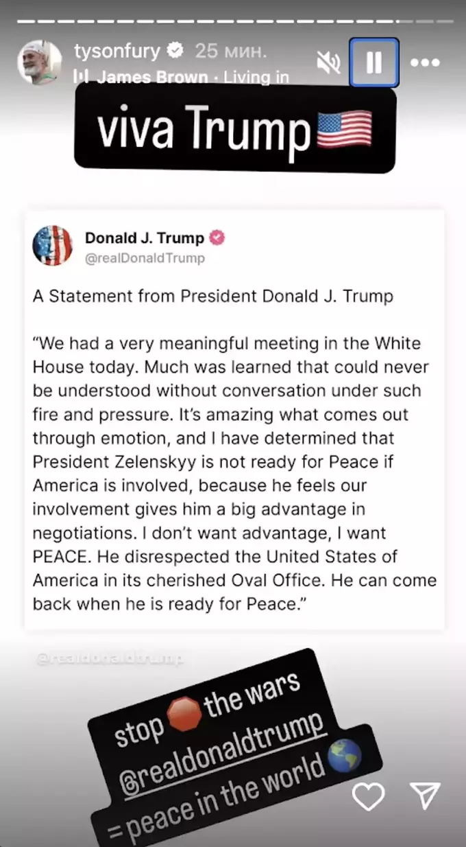 «Давай, Трампе, розберися з цим, малий. Слава Трампу. Зупини війни. Трамп = мир у всьому світі», – написав Ф’юрі.