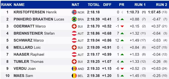 Третім у гіганті фінішував лідер загального заліку Марко Одерматт, який програв переможцю 0.52 секунди.