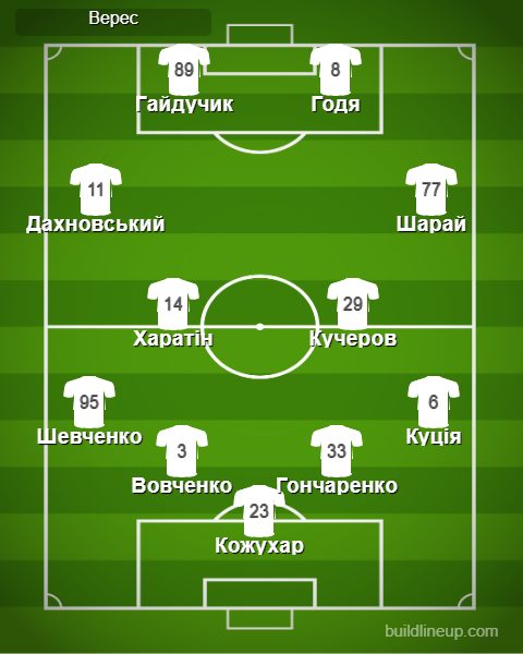 «Верес»: Кожухар – Куція, Вовченко, Гончаренко, Шевченко – Шарай (Сміян, 83), Харатін, Кучеров, Дахновський (Протасевич, 90+1) – Гайдучик (Степанюк, 83), Годя (Кльоц, 77)