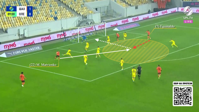 Те, що не вдалося втілити у життя Царі на 59-й хвилині, чудово реалізував на 90-й Матвієнко. Центрбек «Шахтаря», увірвавшись у штрафний майданчик суперника і опинившись у схожій ситуації, не став бити, а ризикнув прострілити в центр на Егіналду, перед яким була така ж вільна зона, як і у Філіппова з Мішньовим. При цьому, зверніть увагу, що якщо Царі в середині другого тайму намагався протидіяти лише один Бондар, то проти Матвієнка де-факто діяли аж чотири суперники, що значно підвищувало ризик перехоплення передачі. Але Микола, по-перше, чудово побачив позицію Егіналду, а по-друге, миттєво прорахував, що такий варіант для команди буде набагато привабливішим, аніж банальна спроба завершити епізод ударом по воротах. Це і є проявом майстерності, яка у цьому конкретному матчі зіграла на користь «Шахтаря»…